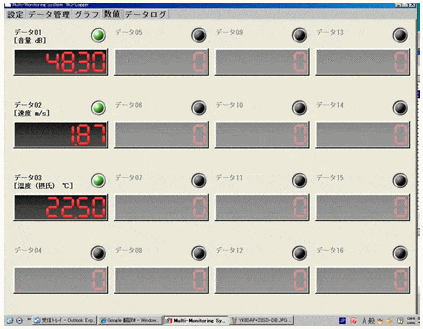 | 設定画面 | ●各測定器の測定データを自動認識でチャネルに割り付ける。 ●単位も自動設定 ●各チャネルでアラーム (各チャネルのランプ表示、音)の上限値、下限値の設定可能 |