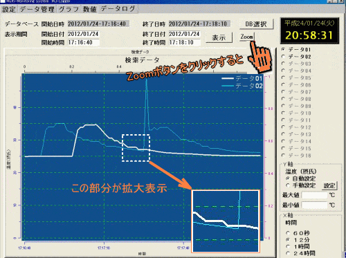 | データ記録 | ●開始/終了時間毎にファイルを自動作成。 ●各記録ファイルの中の測定データが見やすい ●測定データをすぐにグラフ表示可能 ●データの削除も簡単 ●データのCSV出力も簡単 ●この画面でもZOOM機能あり。 ●時間の設定で希望のデータ区間を拡大、縮小可能。 |