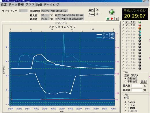 | グラフ | ●自動Y軸調整(最大、最小値から自動的にY軸のレンジを設定する。) ●手動調整あり(限定機能) ●時間軸レンジ選択可能(60"、12'、1時間、24時間) ●ZOOM機能あり(見たい部分を拡大可能) ●選択されたチャネルの単位がY軸に表示され、グラフが太く表示される |
